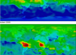 Obr. 1. Satelitní snímek Země s obsahy oxidu uhelnatého ve spodních vrstvách atmosféry pořízený geografickým satelitem NASA „Terra“ s pomocí senzoru „MOPITT“.