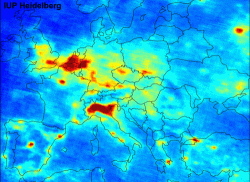 Obr. 2. Rozložení koncentrace NO2 v ovzduší nad Evropou (červená = zvýšená koncentrace)